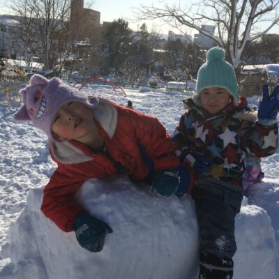 園庭での雪遊びではおしり滑り、そり滑りをダイナミックに楽しんだり、雪玉づくりを楽しんだりしました💛