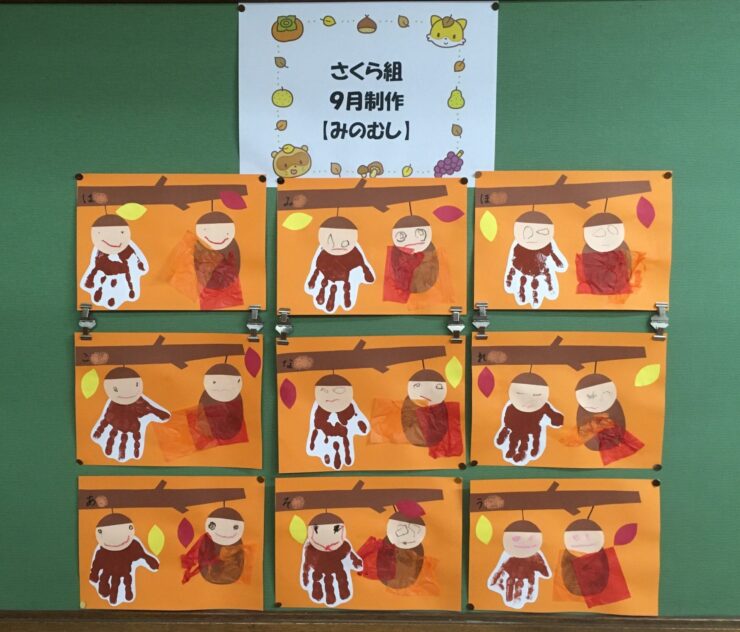 さくら組さんの教室前に9月の制作が掲示されました。タイトルは「みのむし」です!