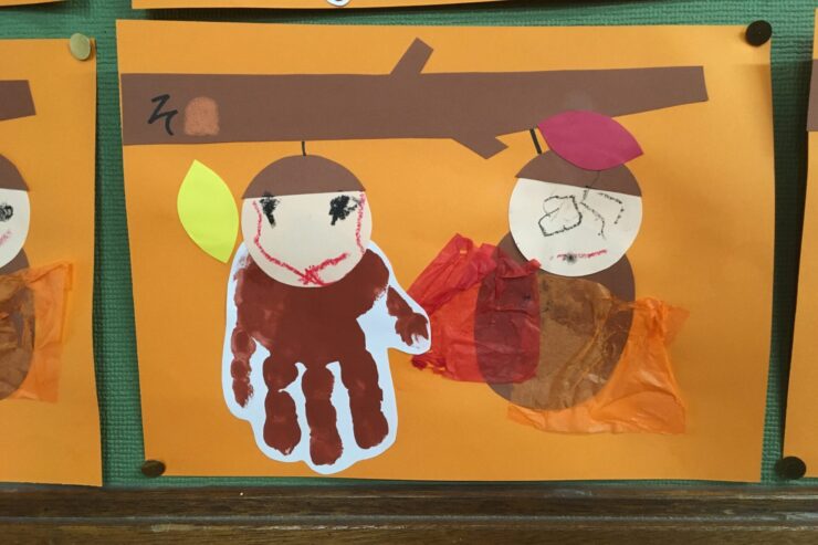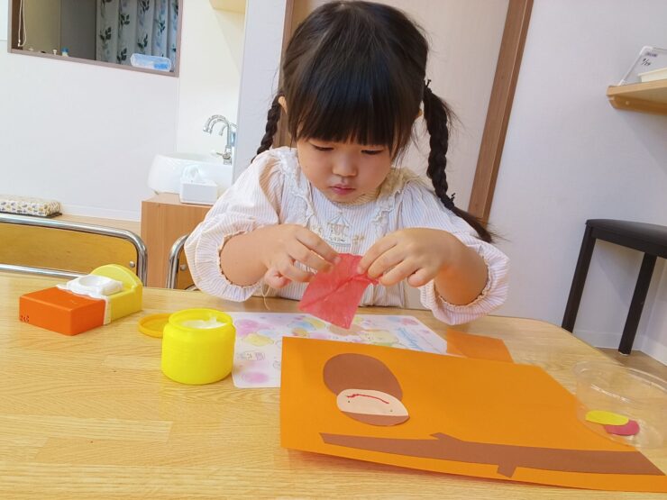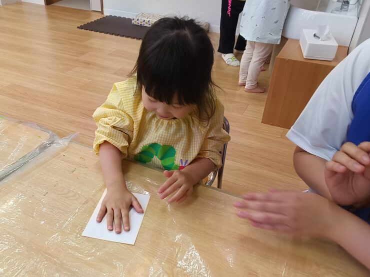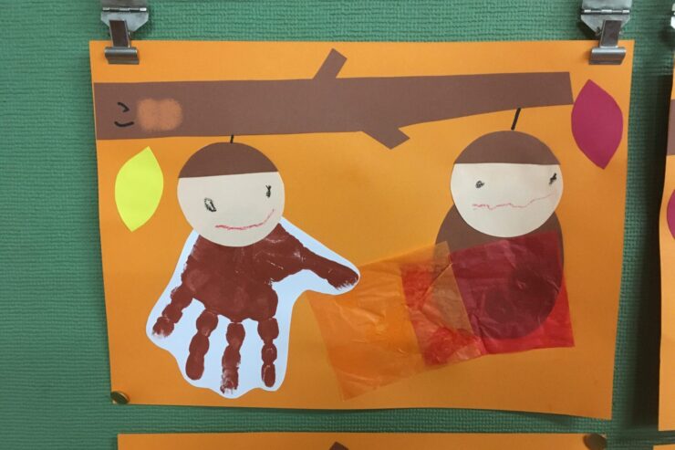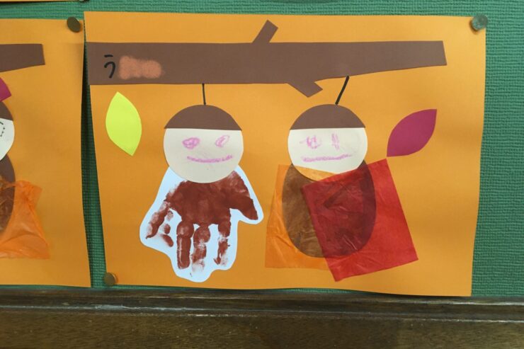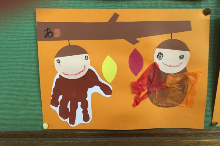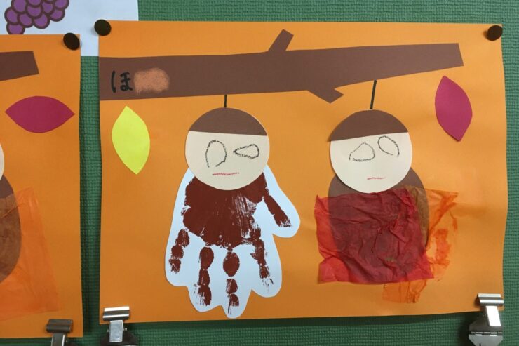 手形でみのむしの体を表現したり、葉をつける位置や顔の表情などそれぞれの工夫がみられたり、すてきな作品ですね。
