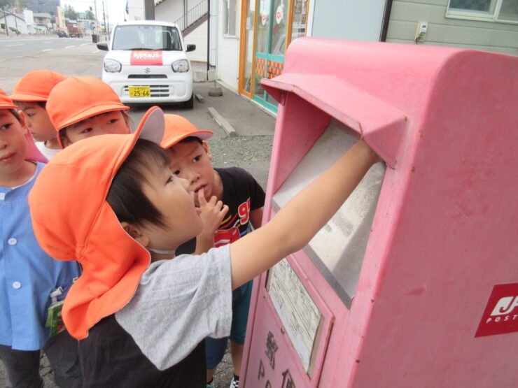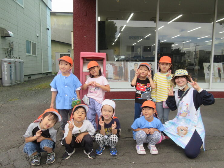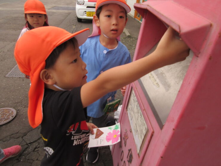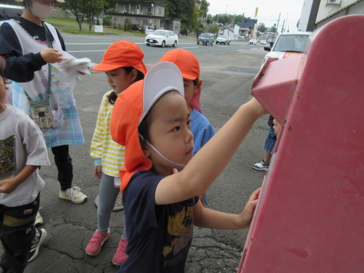 今日の朝の自由遊びの後、歩いて近くのポストへ敬老の日のハガキを投函しに行きました。