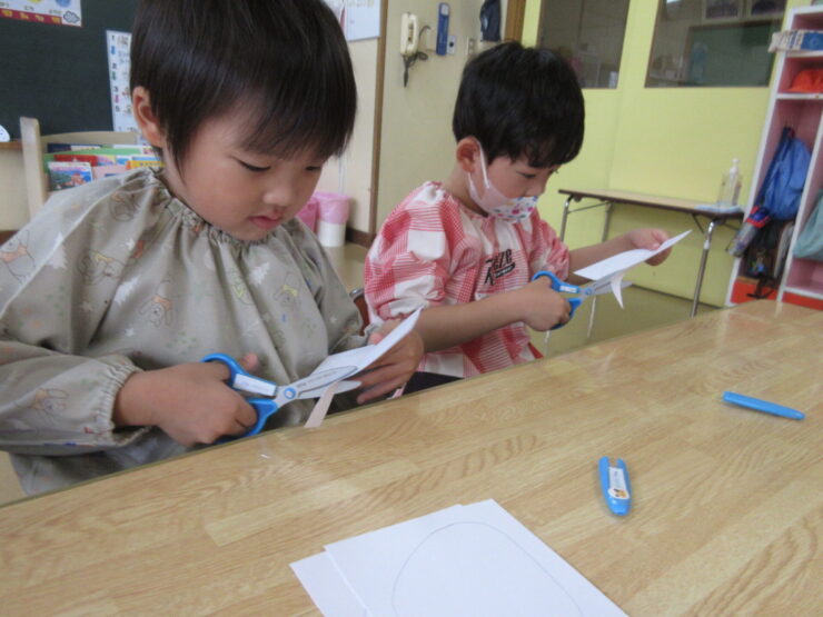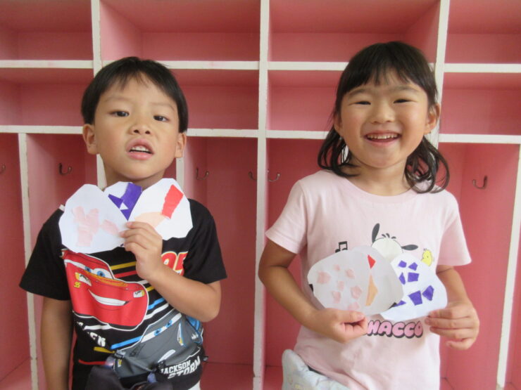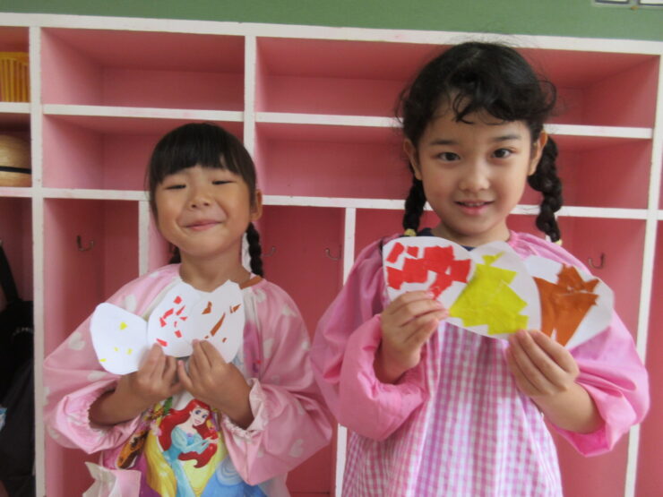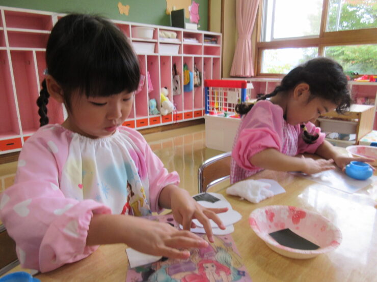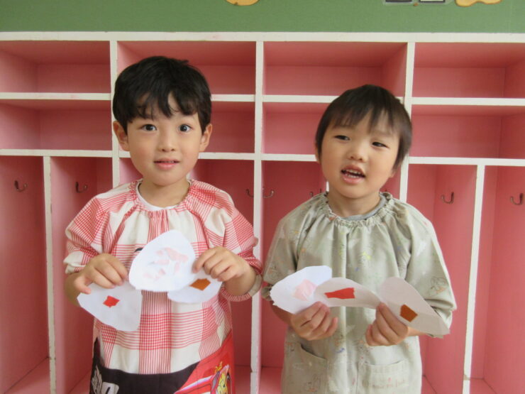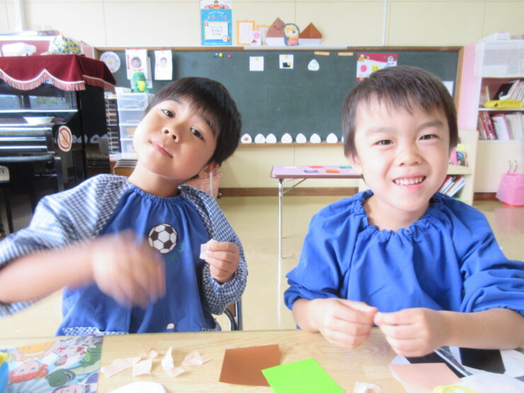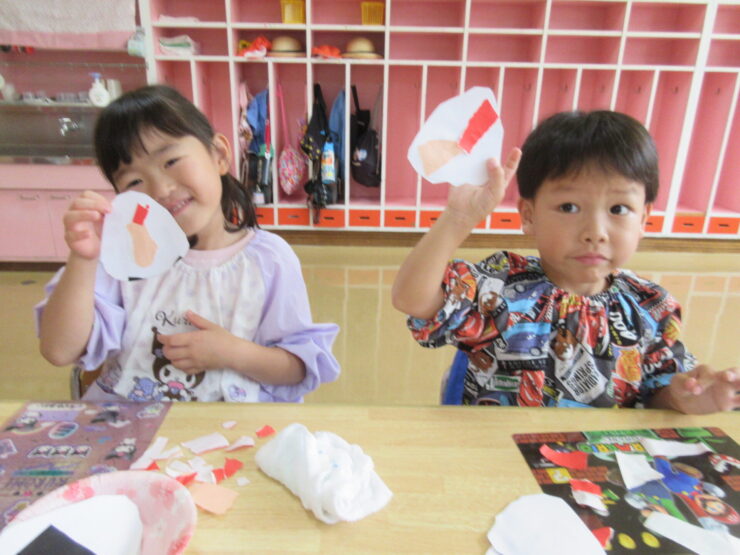 また、なかよしチームの日の活動として、おにぎりカードゲームを作りました。ペアになって味を選び「梅がいいけどどう?」などと話し合いながら楽しそうに作っていたばら組さんでした。