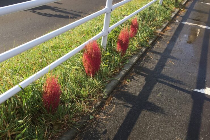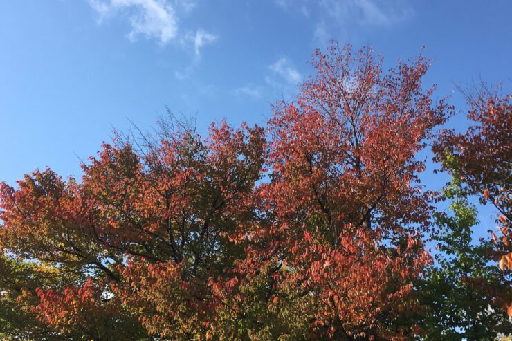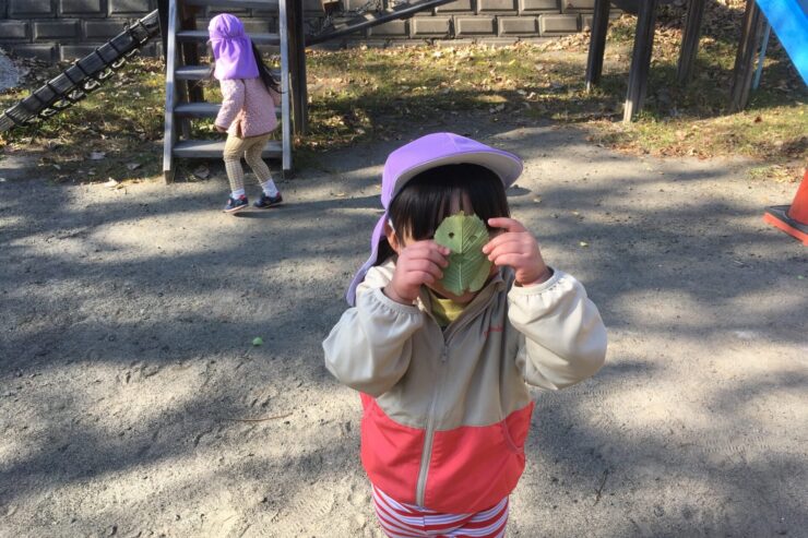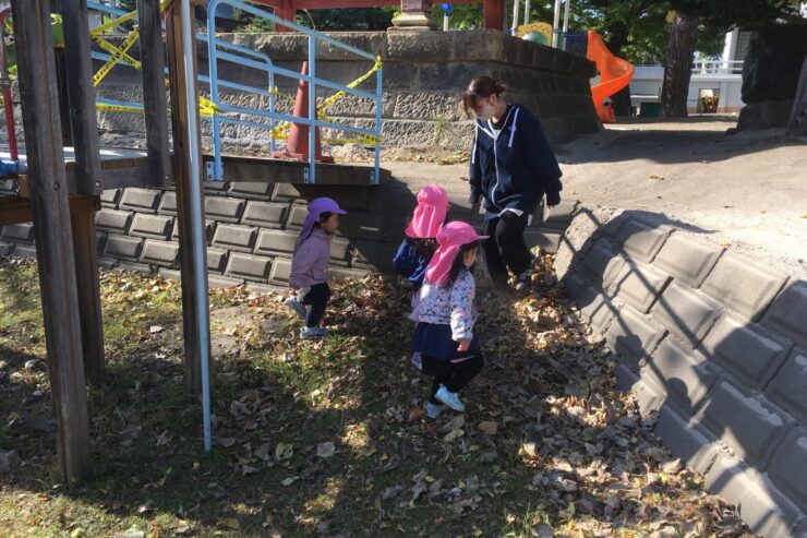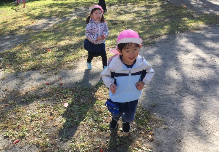 桜の葉が赤く色づき、落ち葉のたまる場所では足踏みをしてシャカシャカときれいな音を楽しんでいました。