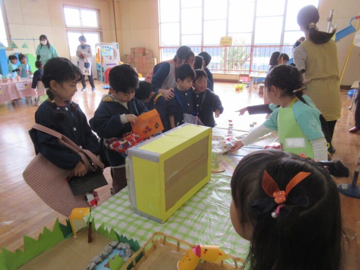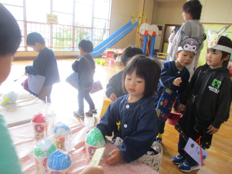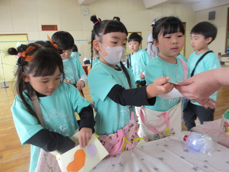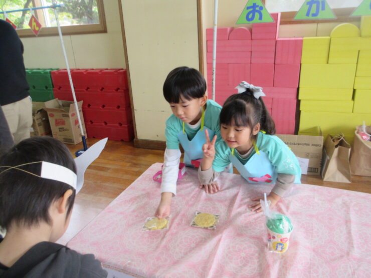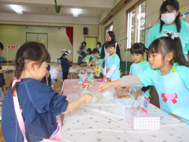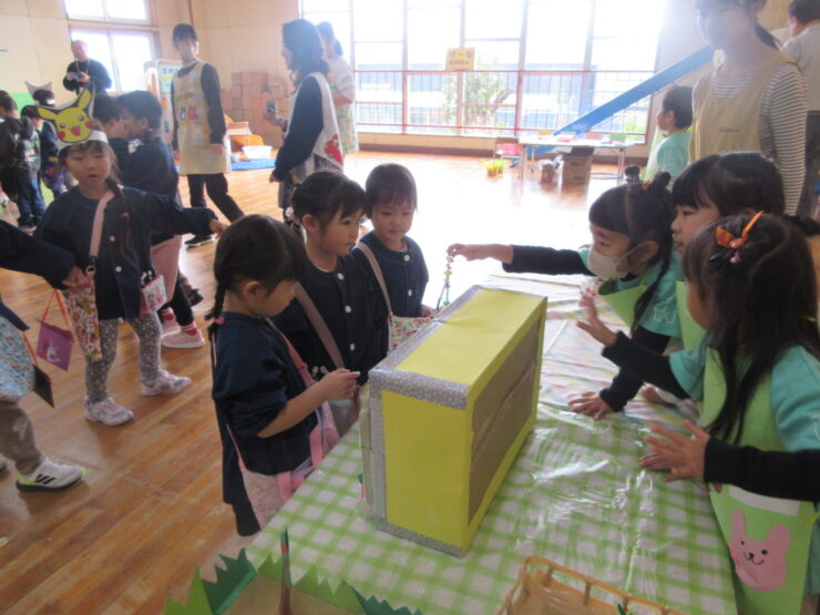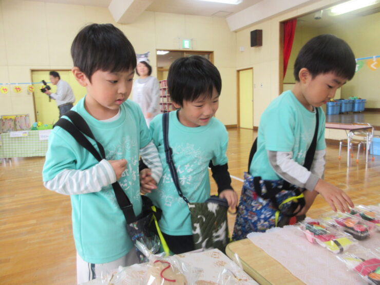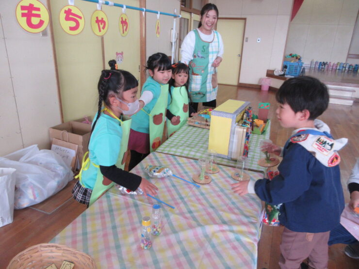 年長さんがお店屋さんになり小さいお友だちがお買いものをします。