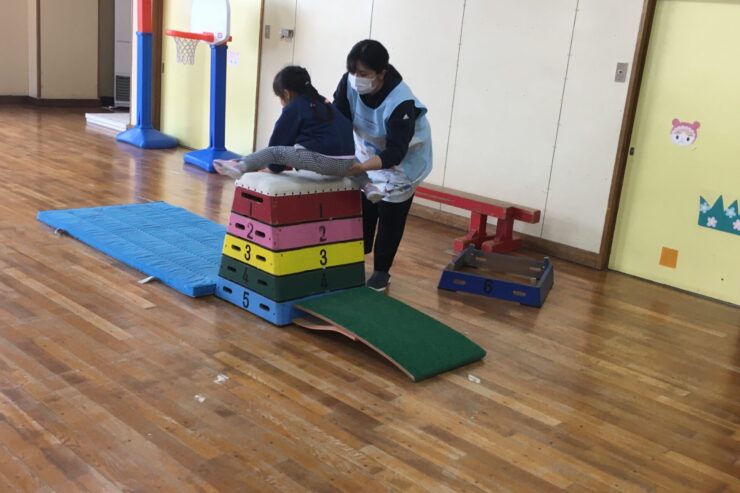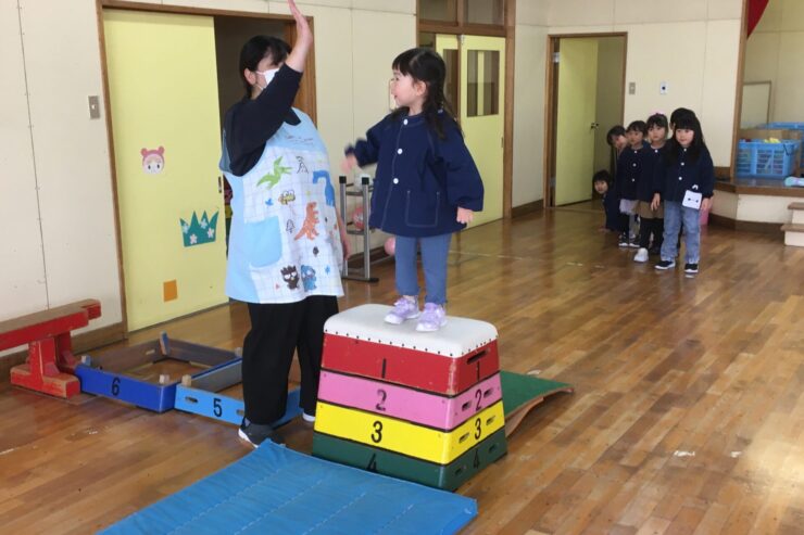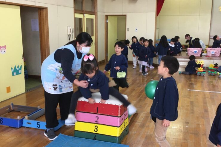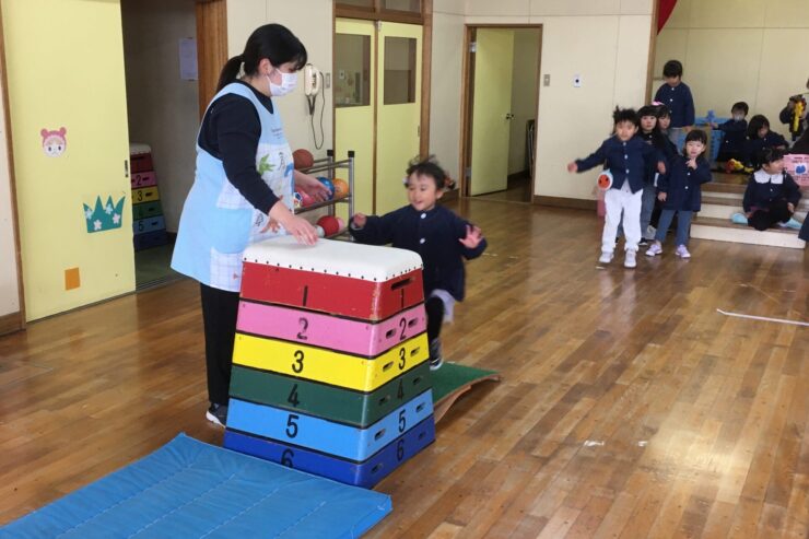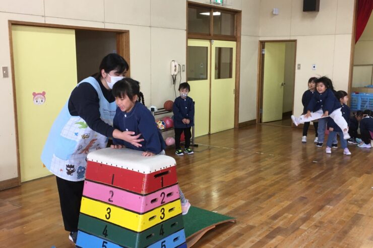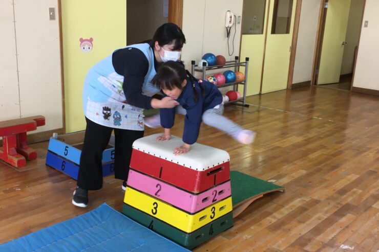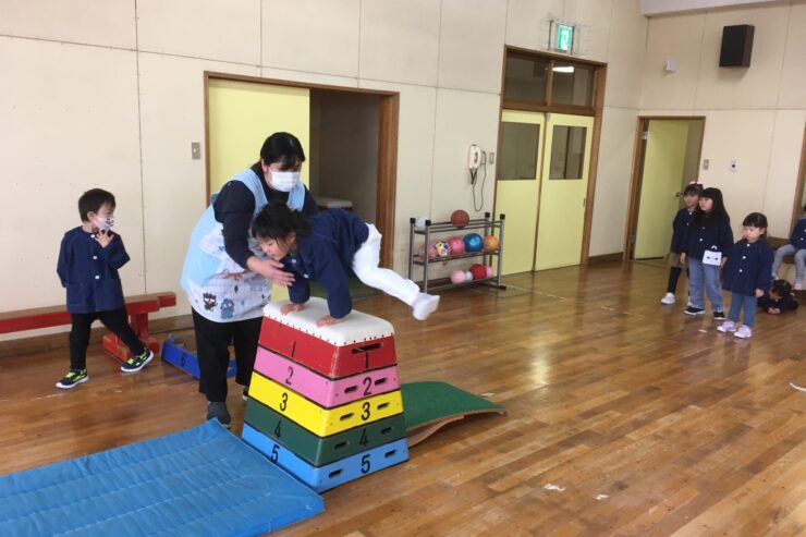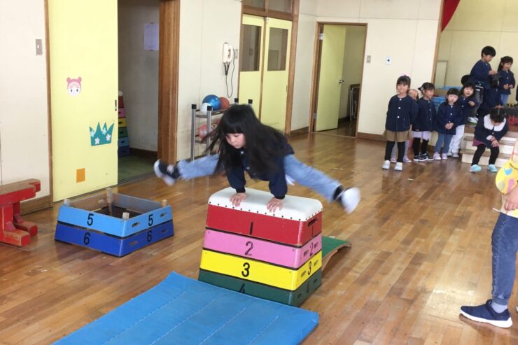 跳ぶためには踏切りで前傾し肩の位置が跳び箱より少し前に出る必要があります。怖いとそれができないのですが、少しずつ励まし、慣れていき、怖くないような補助をして練習すると・・初めて跳べてうれしそうにする子もいました✨