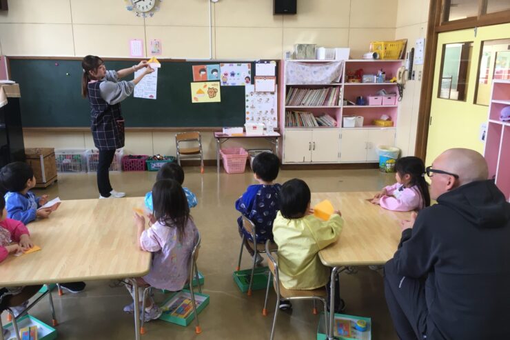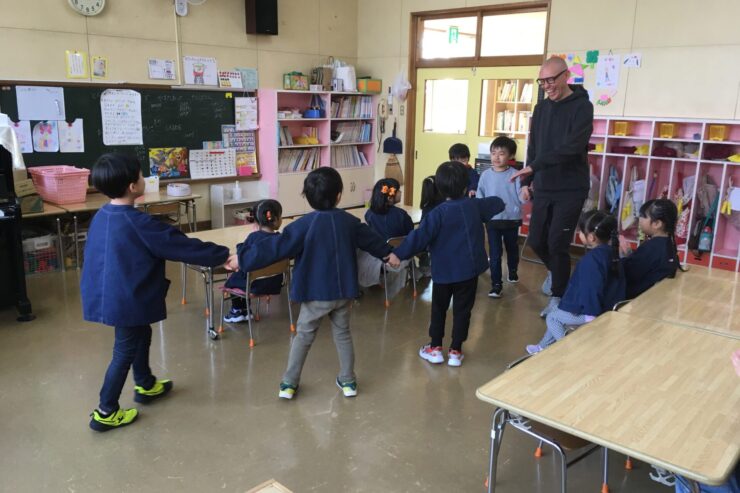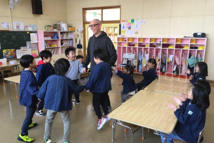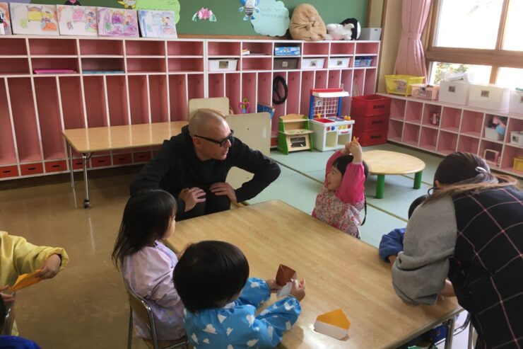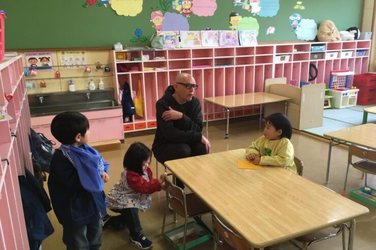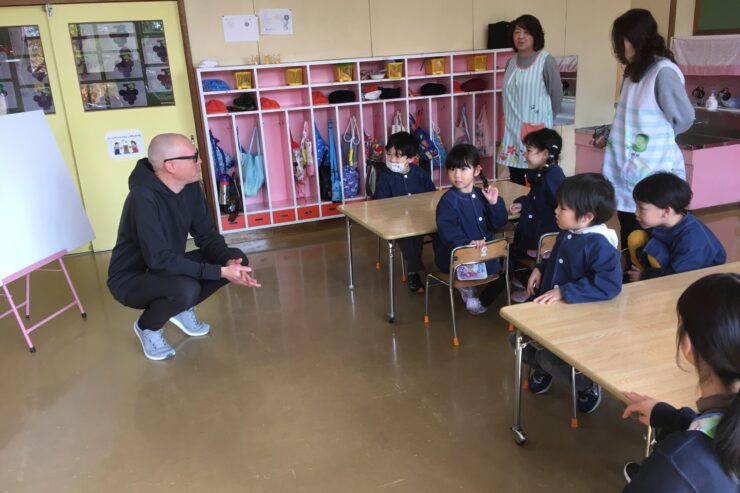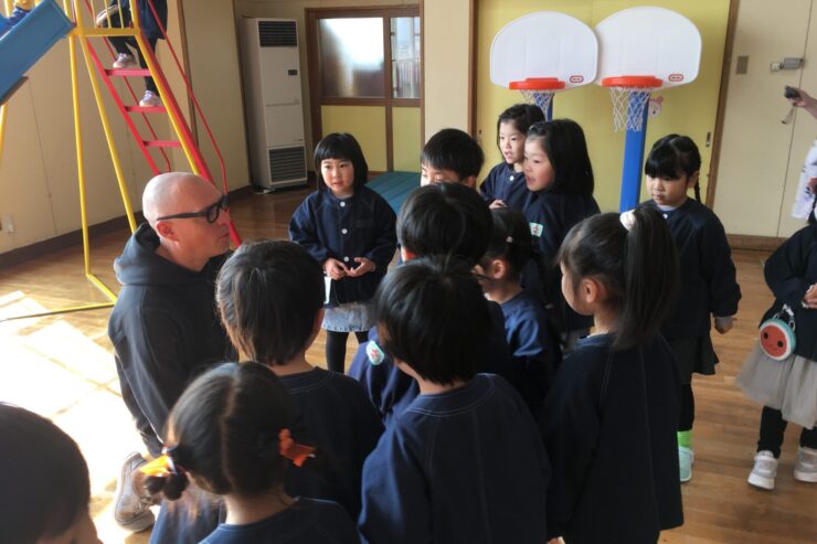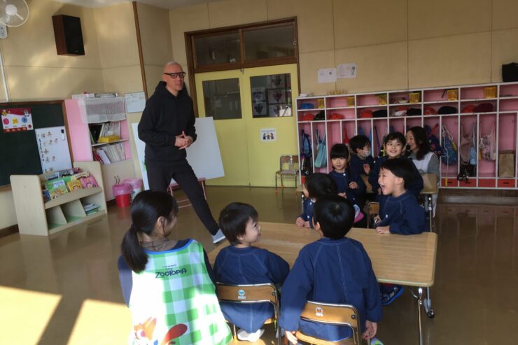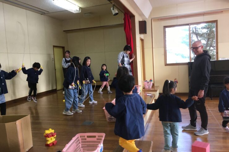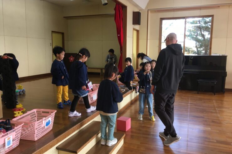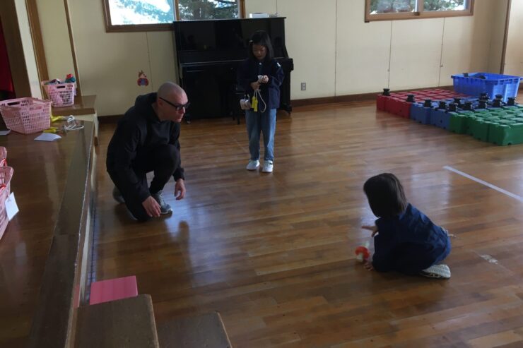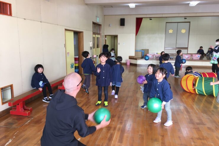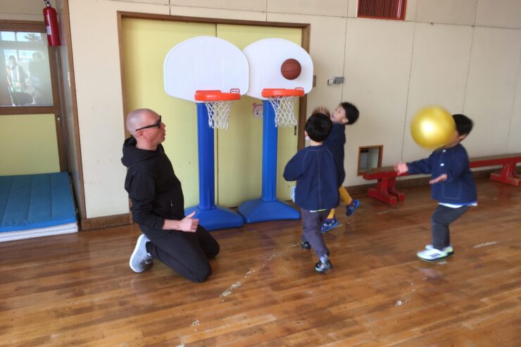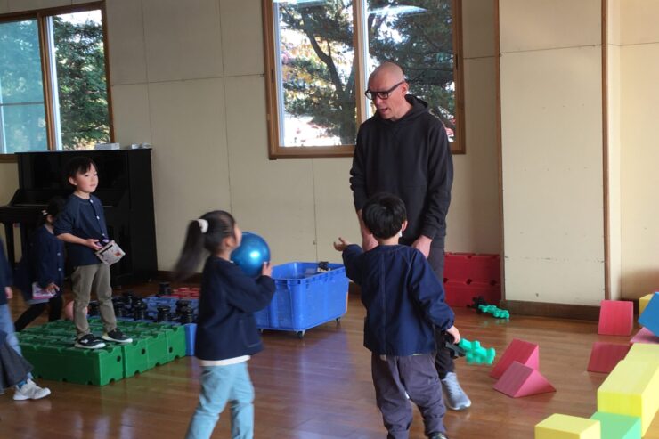 今日は初めてなので、子どもたちの遊びや活動を見てもらう予定でしたが、年長さんが「グッモーニン!」と声をかけると、そこから一気に距離が近づき、早速子どもたちと楽しく遊んでくれました。