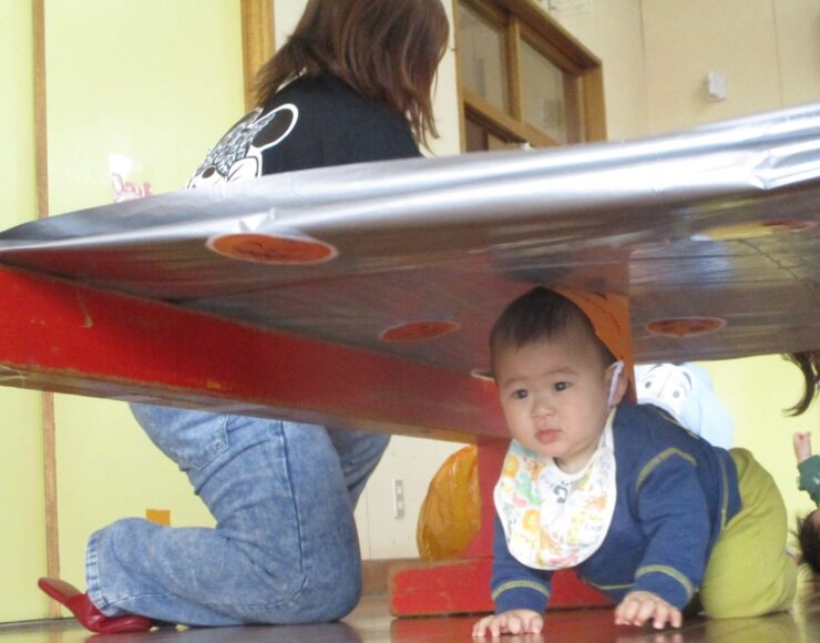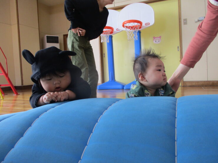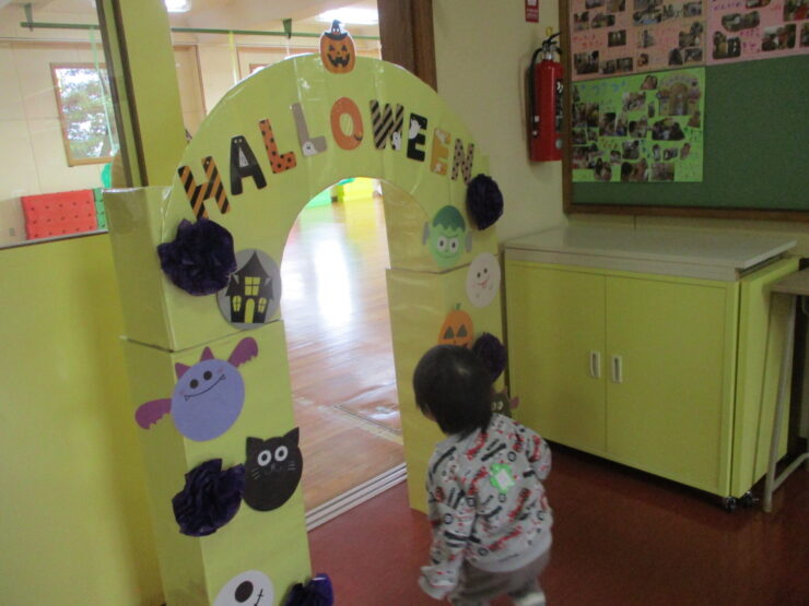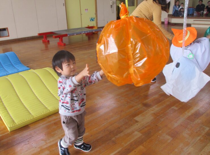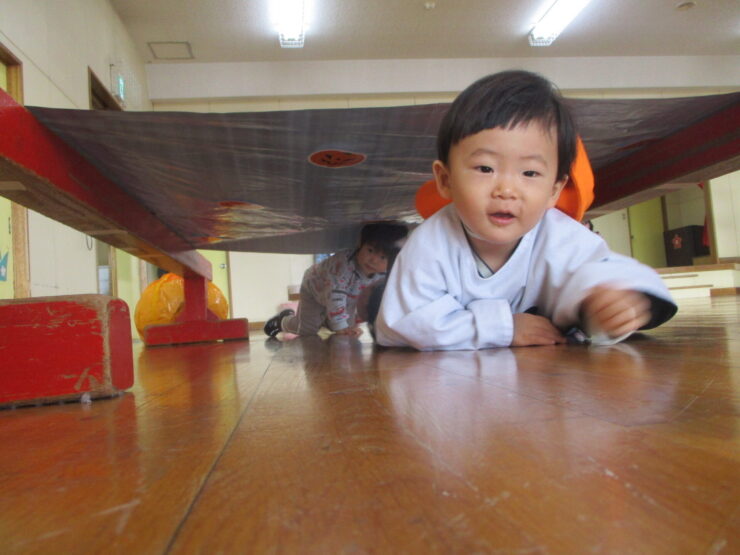 ころころさんのハロウィンは・・アーチをくぐってお遊戯室へ行き、ハロウィンサーキット遊び♬パンプキンがいっぱいのトンネルをくぐり、でこぼこ山を登って、ふわふわのパンプキンとおばけにタッチしてゴール✨