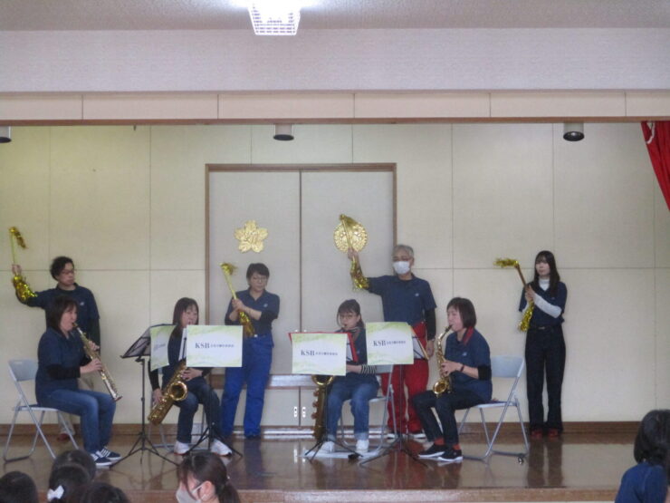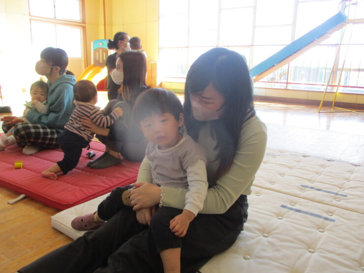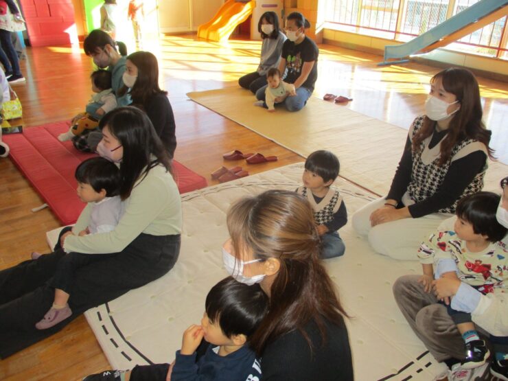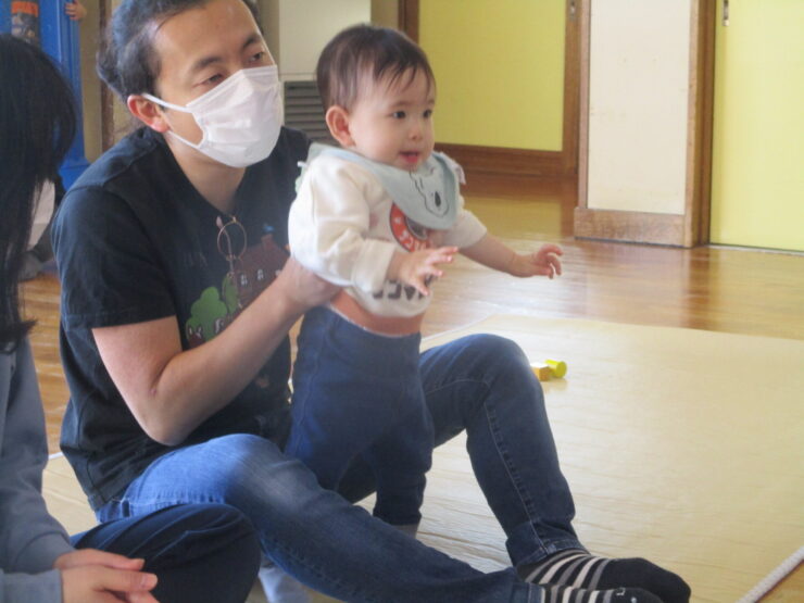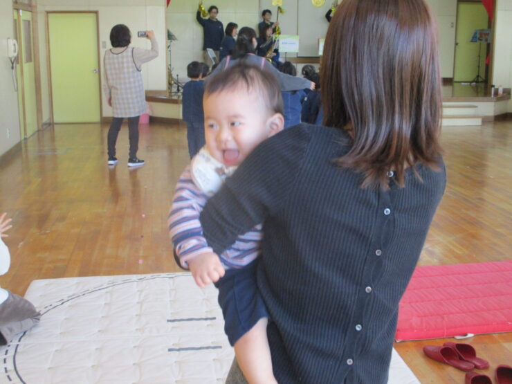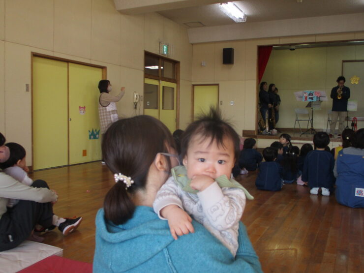サックス、トランペット、トロンボーン、ピアノ・・色々な楽器の音に触れ、じーっと集中していたり、手をたたいたり、お母さんの抱っこで揺れてニコニコしたりと様々な表情が見られました。