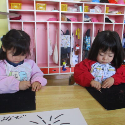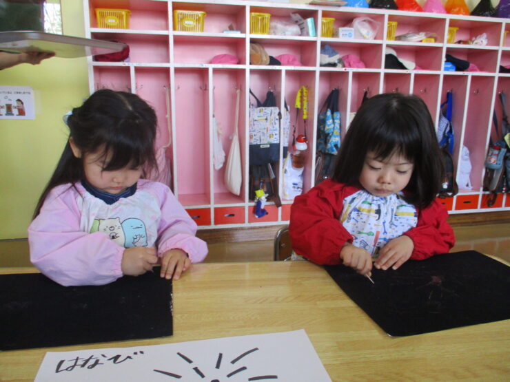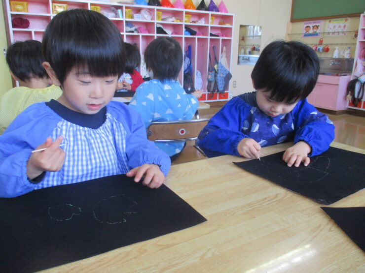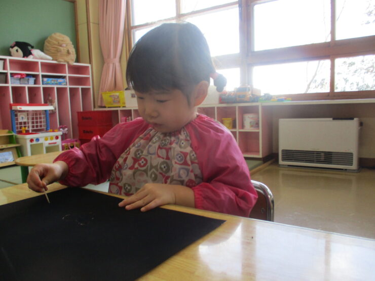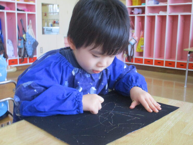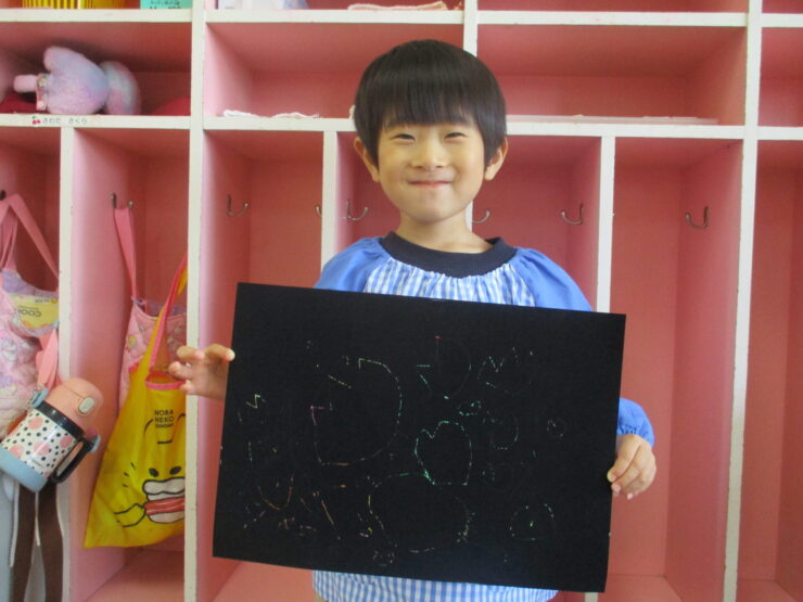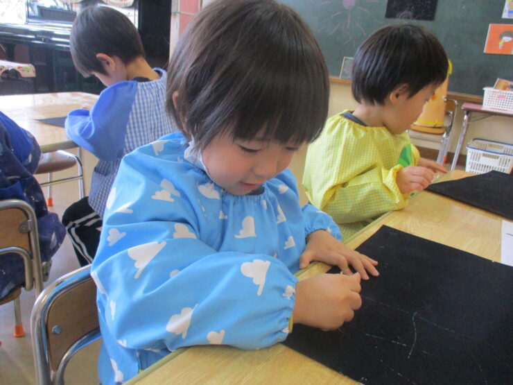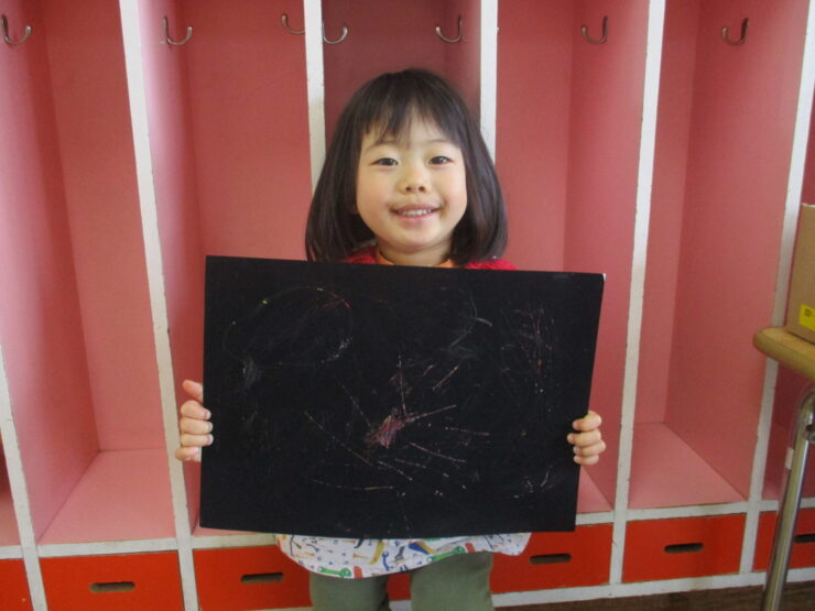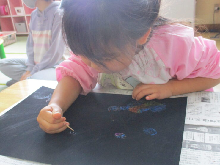 黒く塗りつぶした画用紙を削ると色々な色が出てきて目をキラキラさせながら制作に参加しました。
