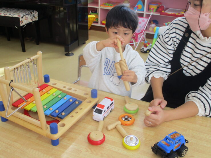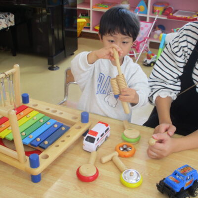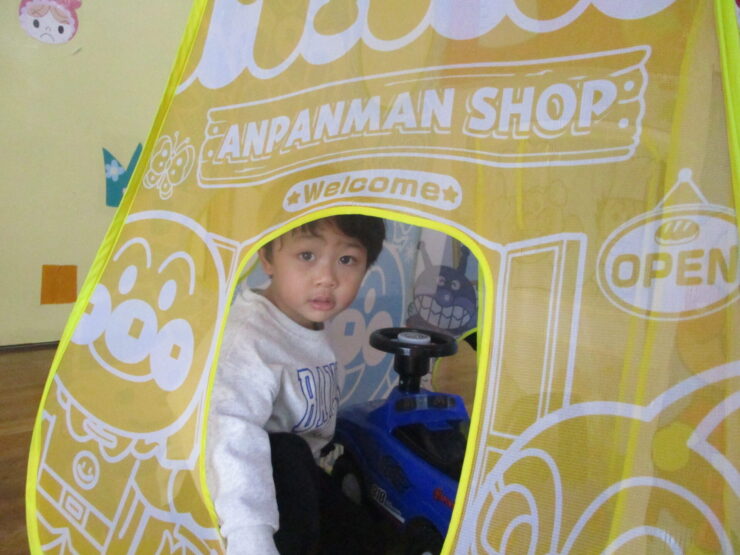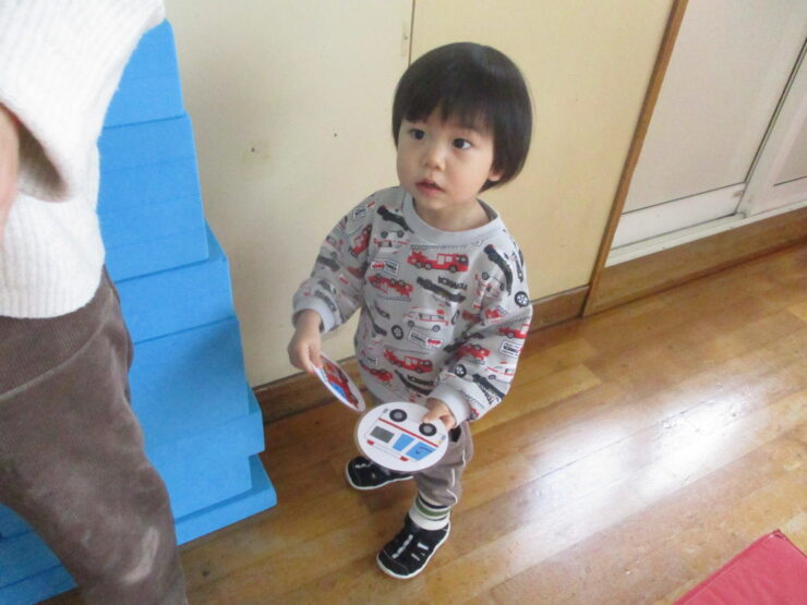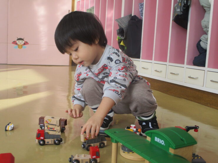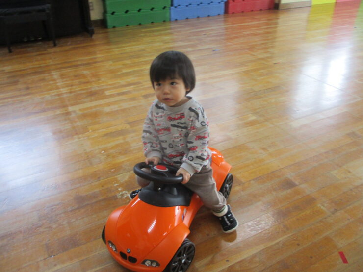 今日はころころ教室のお部屋でBRIOやおままごと、車などで自由に遊んだ後、お遊戯室で”くるまのかくれんぼ”をしました♬
