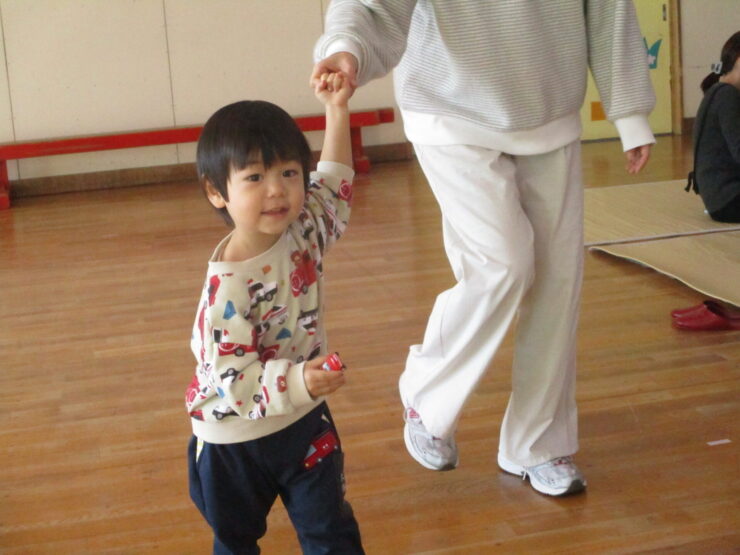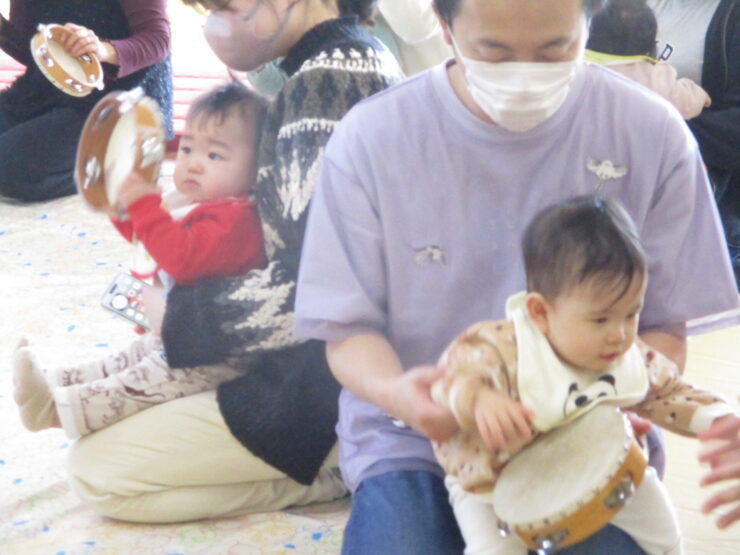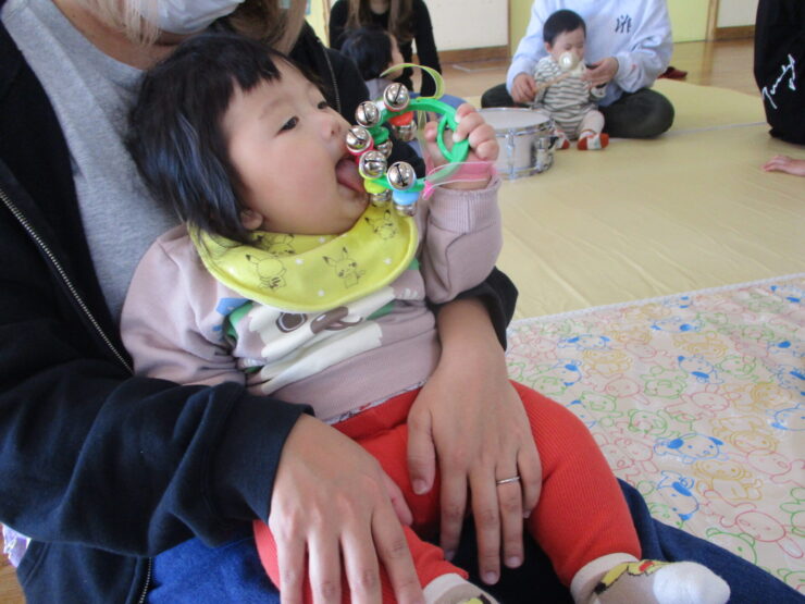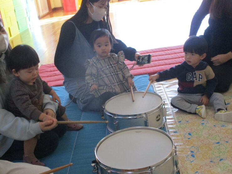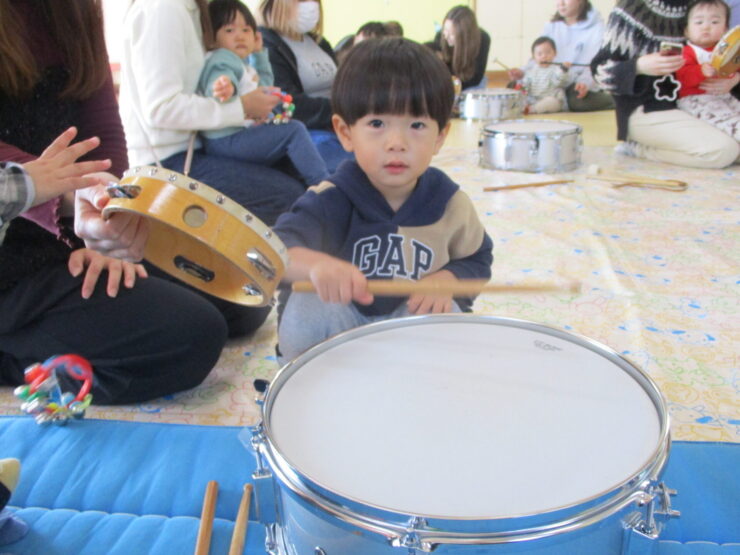 たいこをトントン叩いたり、タンバリン、鈴、カスタネットを自分で持って鳴らしたりすることができましたね!