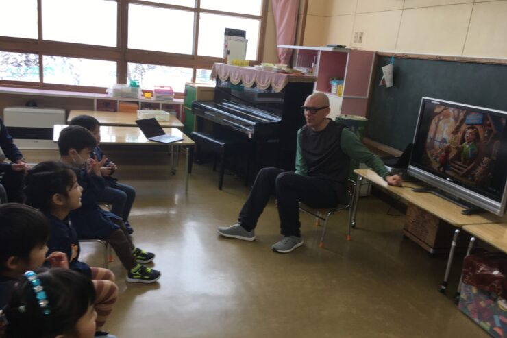 今日使った単語は(カタカナで申し訳ありませんが)グッドモーニング、シッダウン、スタンダップ、ジャンプ、ダンス、グッバイ、ティーチャー、などです。かわいい映像を見ながら英語と動きを結び付けていきます。