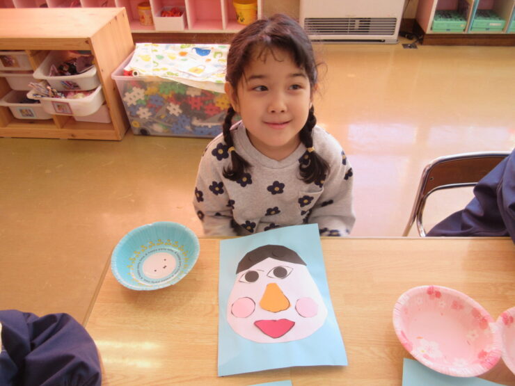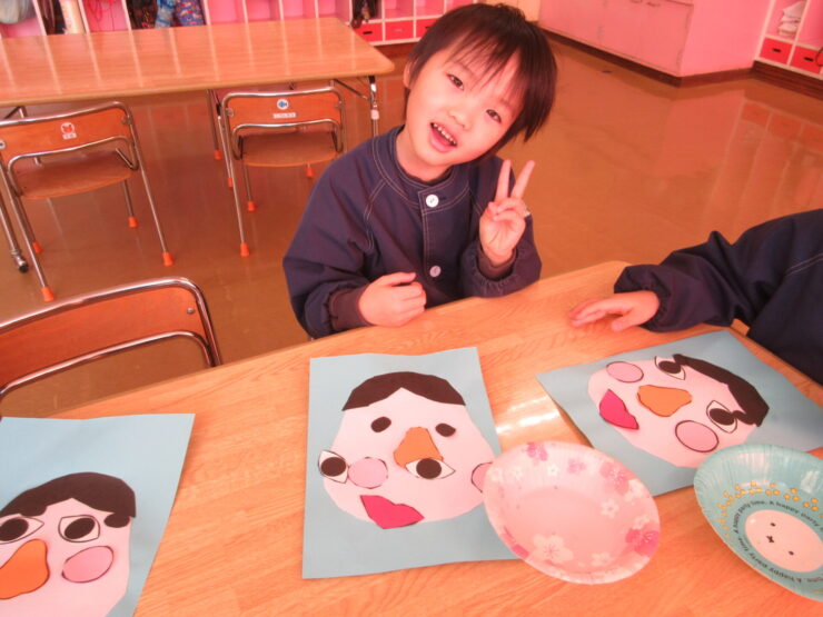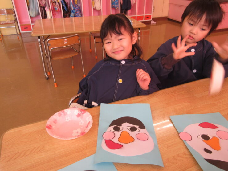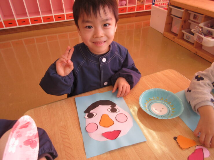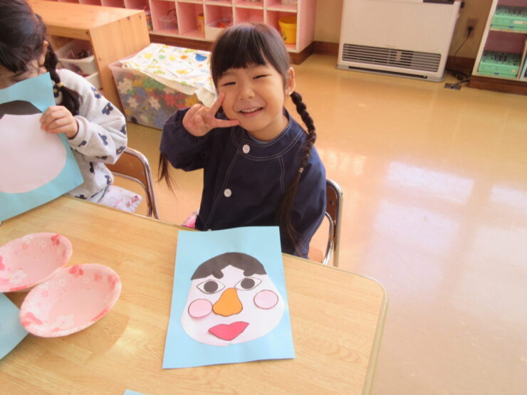 お正月制作~福笑い~(ばら組)🌟2025.12.18今日のできごと今日はお正月制作の仕上げをしました。前回は顔と髪を切って貼り、のっぺらぼう状態に・・そして今回は福笑いの小さなパーツを丁寧に切って完成!最後はみんなで遊びました♬「上手にできた!」「おもしろーい!」とニコニコ笑顔!とても楽しそうでした!いろいろな表情があって面白いですね💛みんなに福が来ますように🌟今日のできごと今日も雪遊び💛前の記事寒い朝~教室窓の雪の結晶❄️次の記事