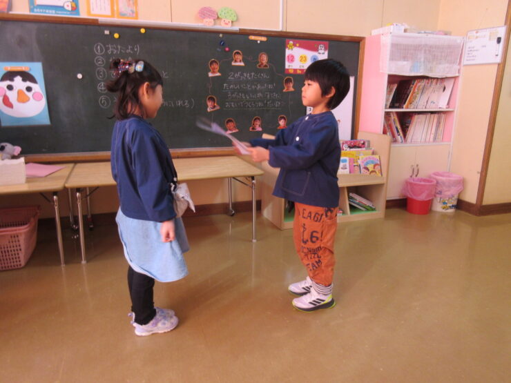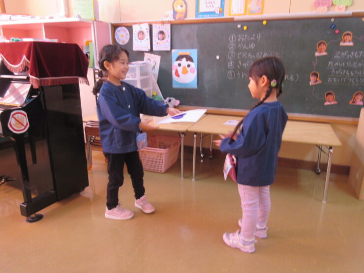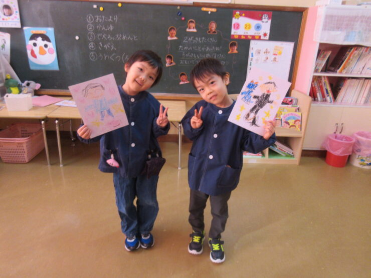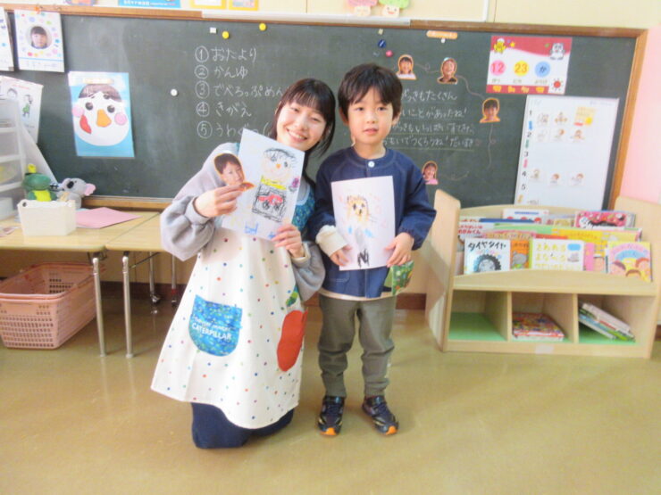 今日で2学期が終わり明日からは冬休みです。今学期は沢山の行事があり1つ1つを通してとても成長したばら組さん。なかよしチームの日のお楽しみとして今回は”似顔絵”と”折り紙(メッセージ付き)”のプレゼント交換をしました💛