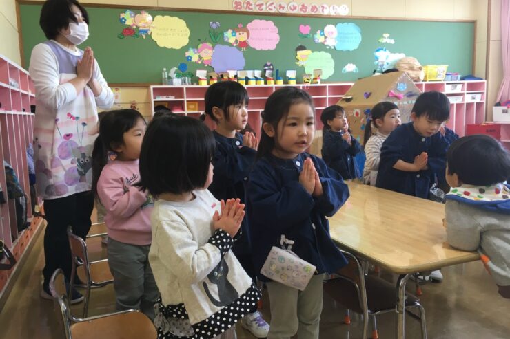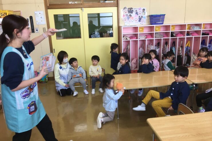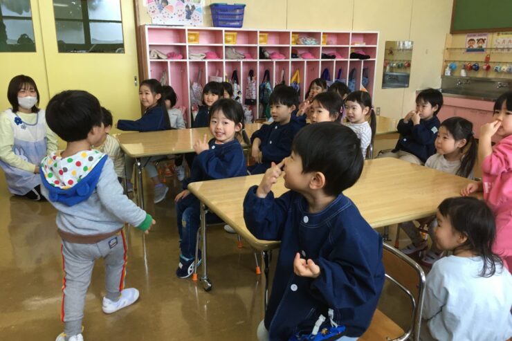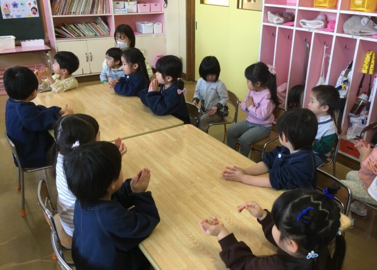 さくら組さんは4月の年少さんの生活に向け、朝の会をもも組さんと一緒に行いました。