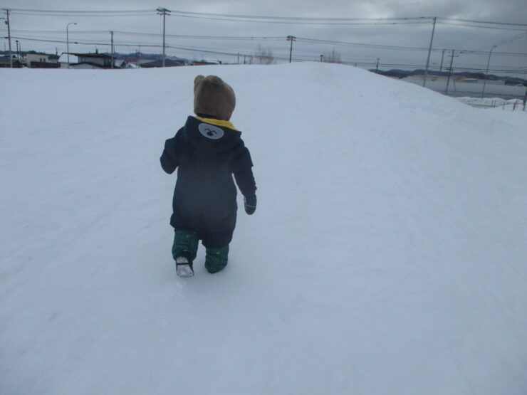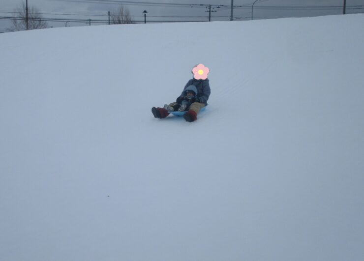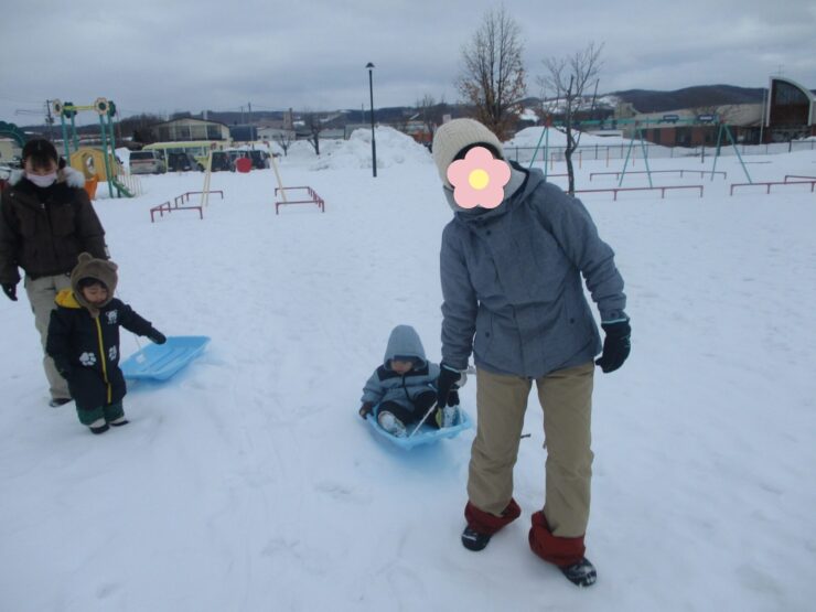 広い公園は雪がいーっぱい!山の上からそりで滑ったり公園の中を歩いてお散歩したり、雪が積もった遊具を探検したりして楽しみました✨