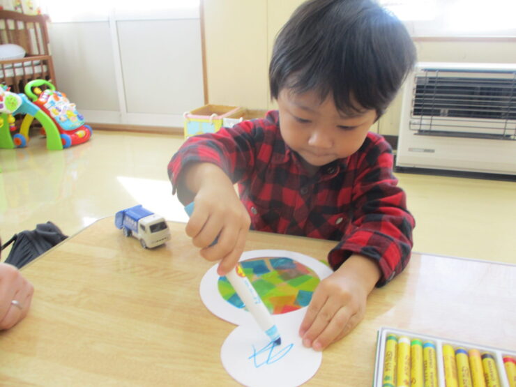好きな色を選びながらじっくりと集中していたお友だちでした。そしてお顔や模様を描いて完成✨