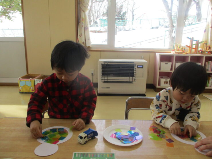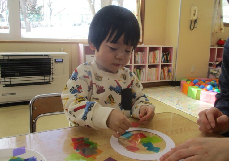 お部屋で朝の会をした後、ゆきだるまのサンキャッチャー作りをしました🌟ゆきだるまのお腹に透明おりがみをペタペタ・・♬