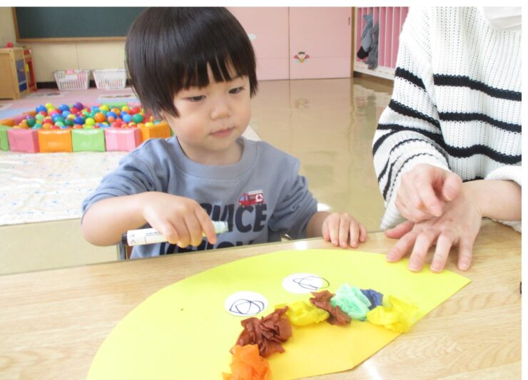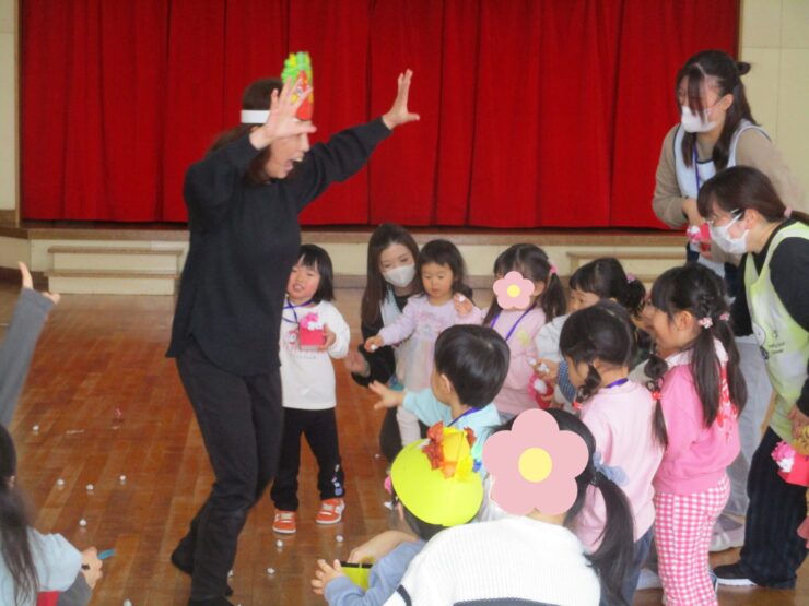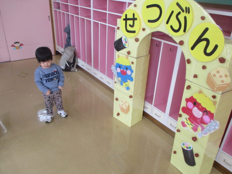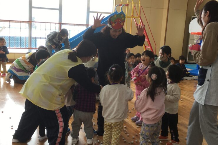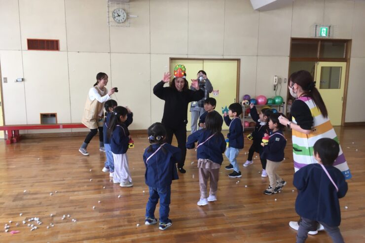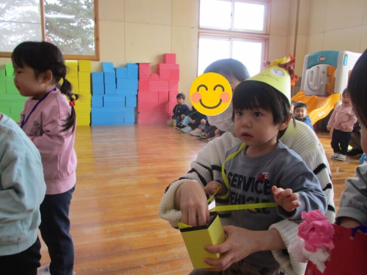 ぴよぴよ教室のお友だちも鬼の帽子と豆入れを作って参加してくれました。ちょっぴりドキドキしたけど豆を投げて鬼をやっつけることができました✨