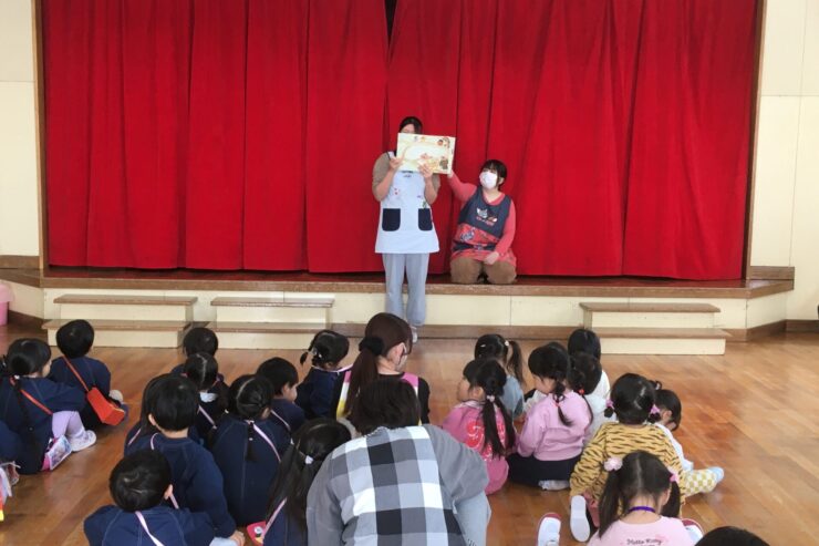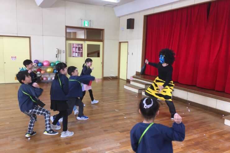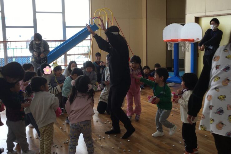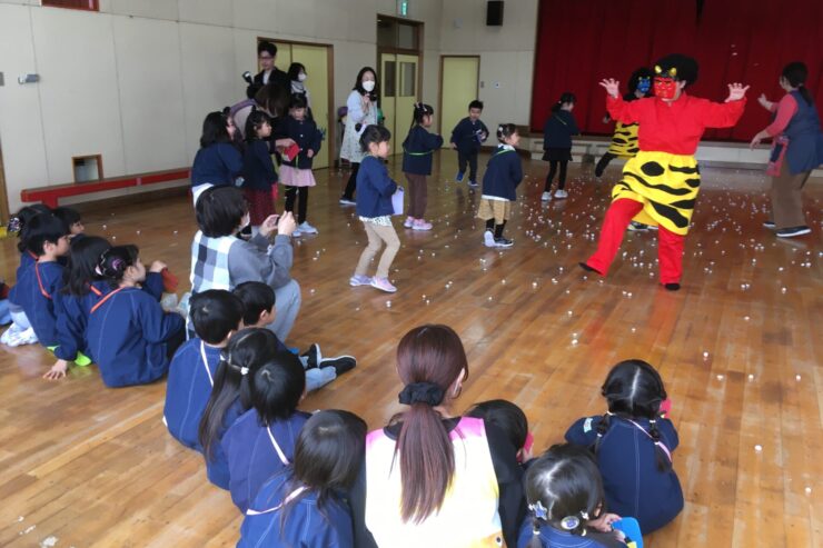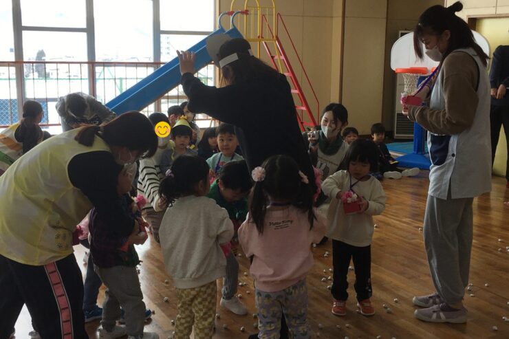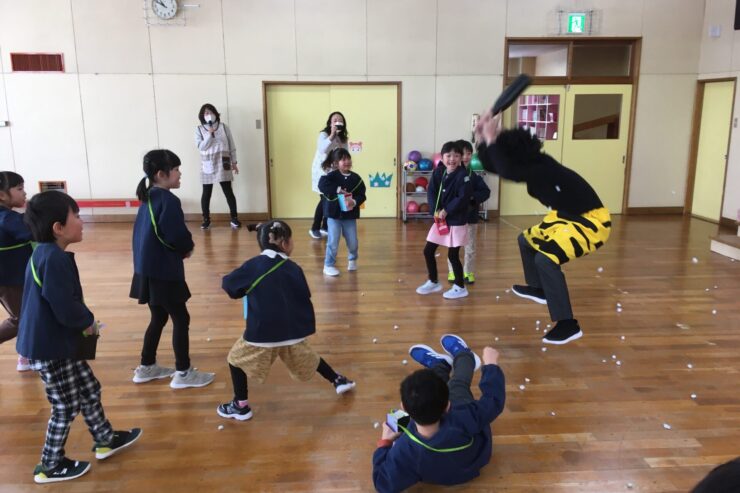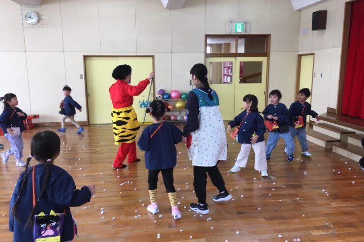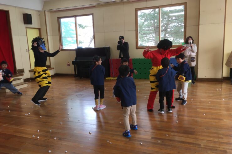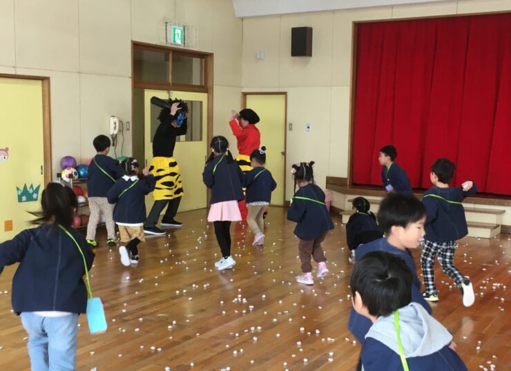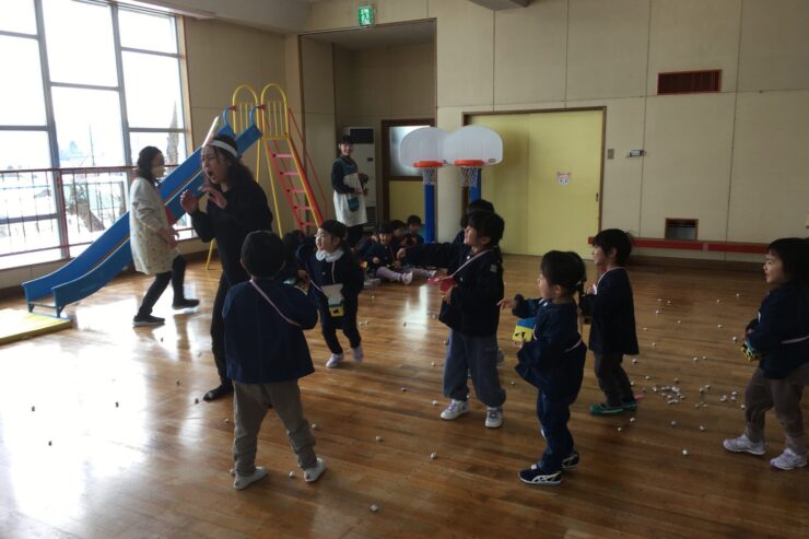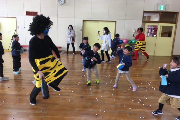 そしていよいよ豆まきです。お遊戯室にやってきた鬼をクラスごとに追い払います✨