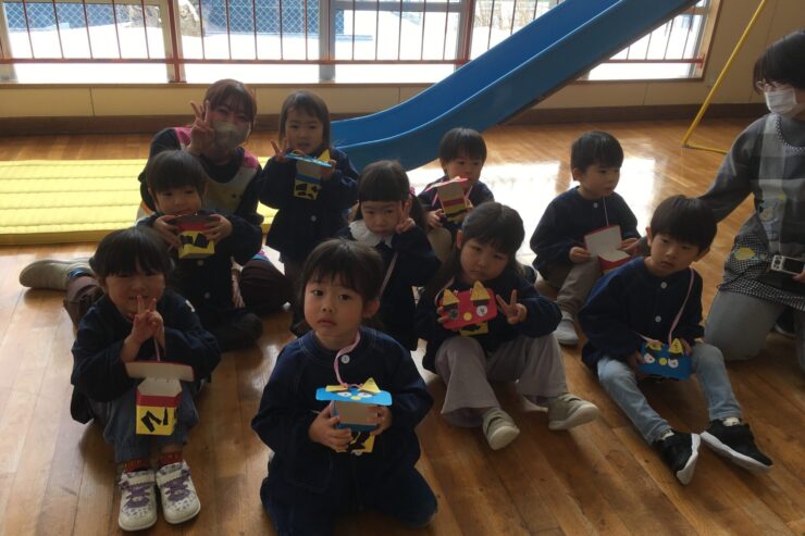 今日は節分。みんなで作った特性豆入れを手に鬼退治をしました⭐