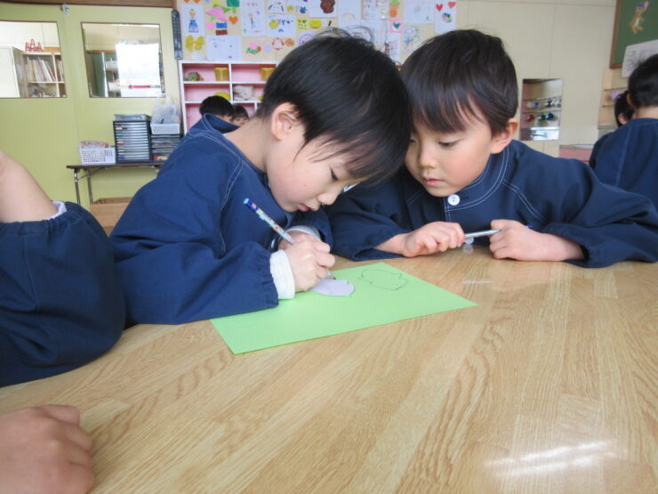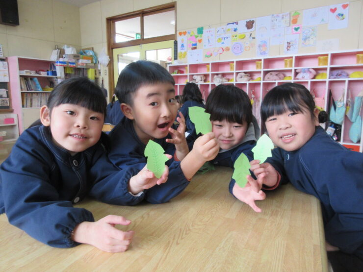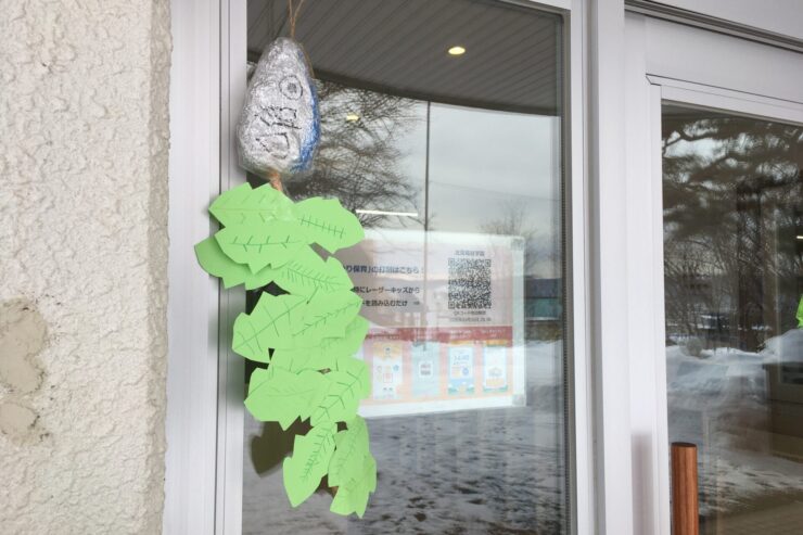 きく組さんは節分クイズで知った「鬼が嫌いな、ひいらぎイワシ」を作って玄関に飾りました。