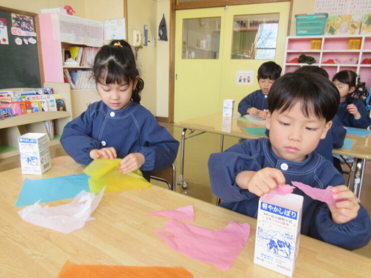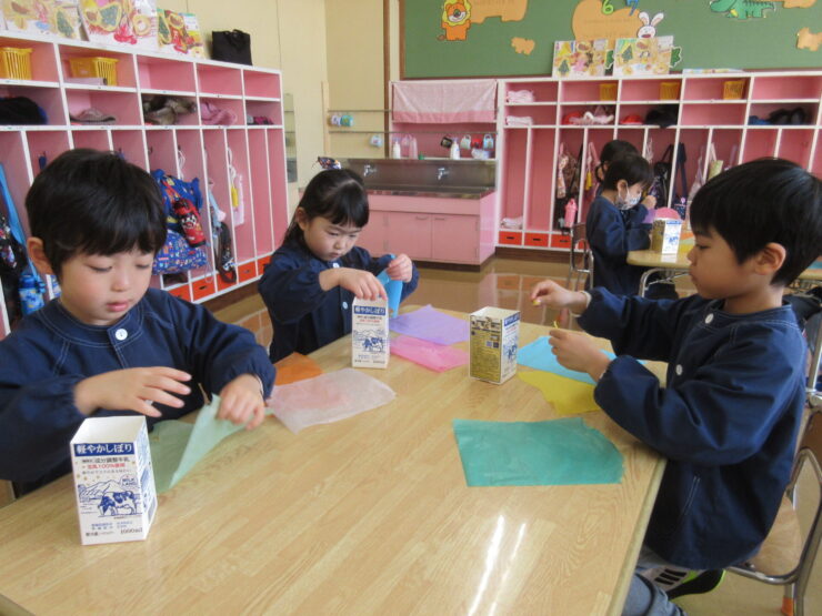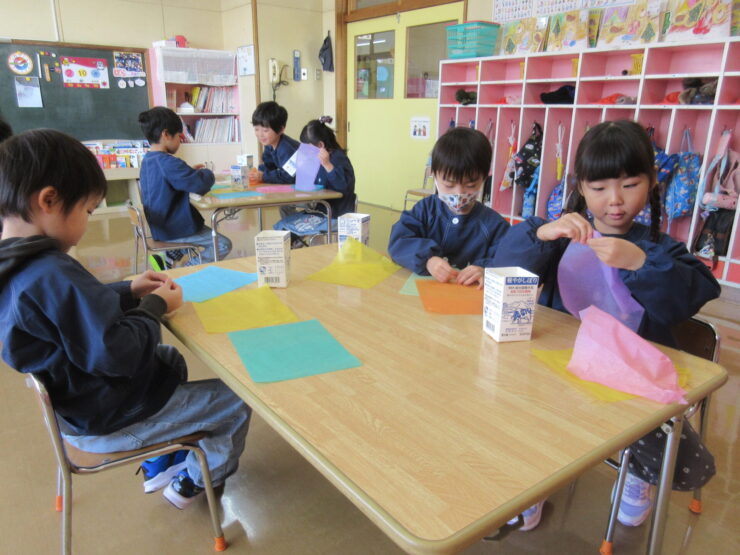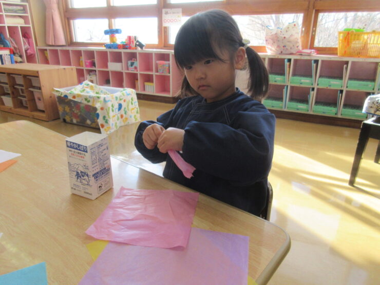 アイスキャンドルでは好きな色のお花紙をちぎって入れ、水を入れると「すごーい!色がついてる!」「美味しそうな色になった!」と楽しそうなばら組さん。