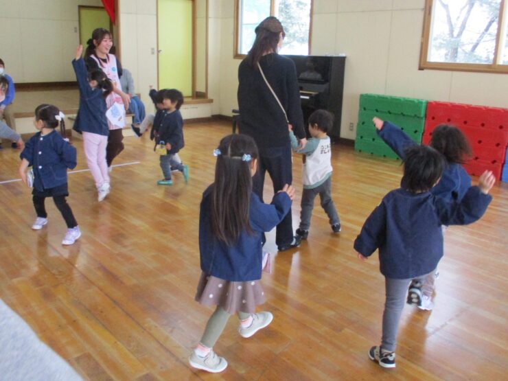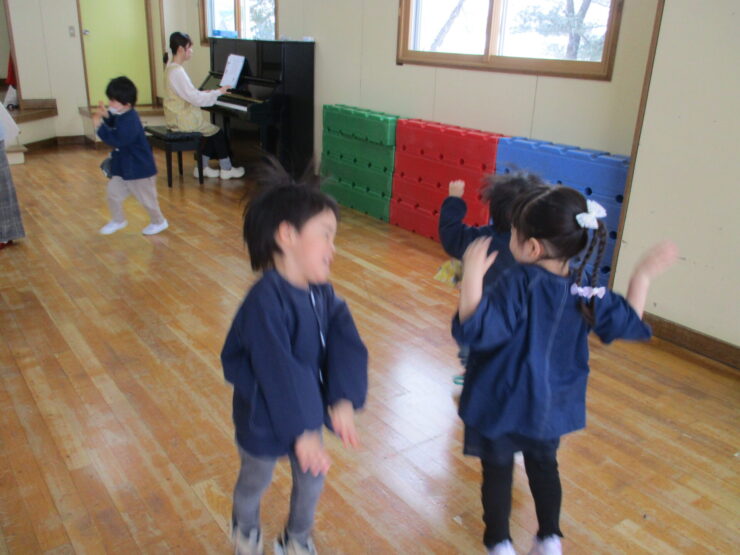 主活動で行ったリトミックではもも組さんも一日入園に来たお友だちもたくさん動いて体がぽかぽかになりました♪♪