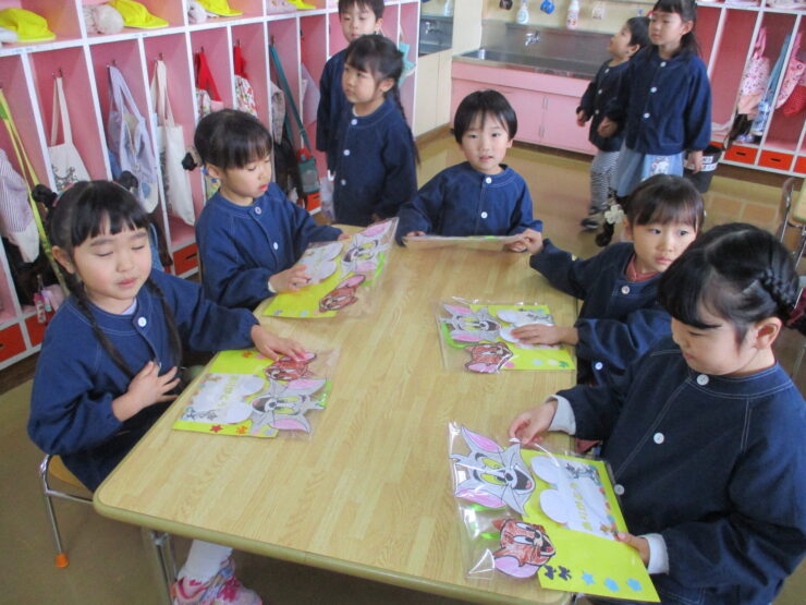 もも組、ばら組さんからは小学校になってから使ってほしいかわいい「時間割表」、そして歌のプレゼントをしました。