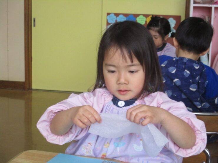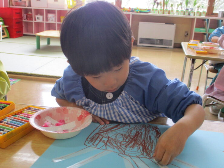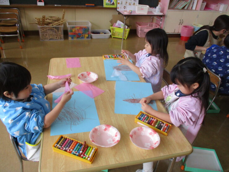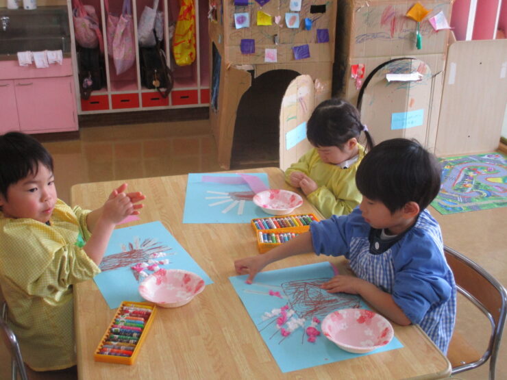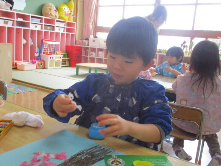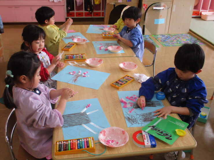 「春に咲くピンクのお花はなーんだ?」と聞くとみんなが「桜!!」と答えるほど大好きな桜のお花をお花紙をちぎって丸めて貼り、きれいな桜の木を完成させることができました✨
