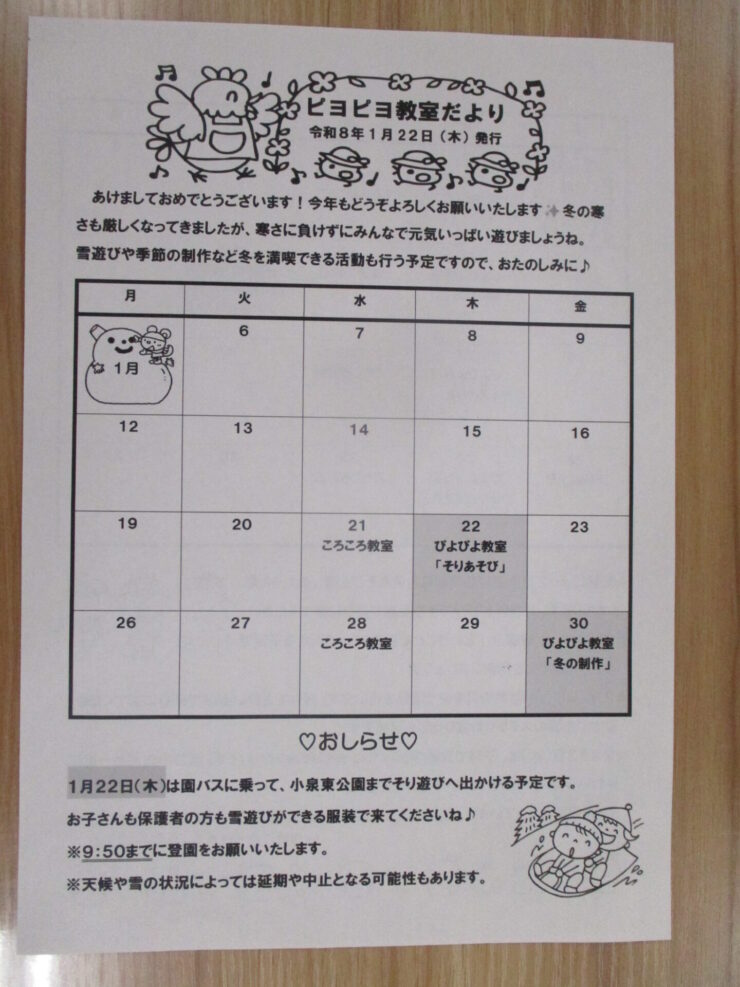 ・1月22日(木)のぴよぴよ教室では小泉公園へそり遊びに出かける予定です。